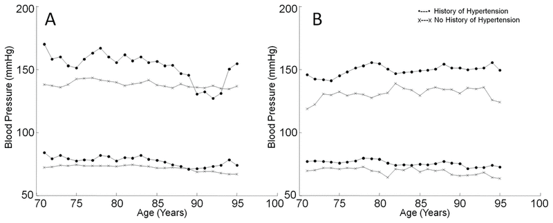 Figure 1A shows the relationship between blood pressure and age for individuals with and without a history of hypertension not taking blood pressure-lowering medications. Systolic and diastolic pressures were higher in individuals with a history of hypertension than in those without. In untreated hypertensive people, systolic blood pressure declined with age in those older than 85 years but increased again above 93 years. In contrast, systolic blood pressure showed no relationship to age in individuals without hypertension. Diastolic blood pressure was not affected by age in either group (Figure 1A). Figure 1B shows the relationship between blood pressure and age in treated participants. Systolic and diastolic blood pressures were higher in individuals with a history of hypertension than in those without, but age had virtually no impact on blood pressure in either group (Figure 1B).