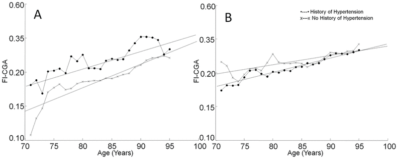 Figure 3 shows the relationship between frailty and age. In untreated participants with no history of hypertension, the slope of the line relating FI-CGA to age was 0.035 (Figure 3A). For people with untreated hypertension, the slope of the line was 0.026 (Figure 3A). Figure 3B shows the relation between FI-CGA and age for nonhypertensive and hypertensive individuals on antihypertensive medication. Slopes of the lines relating FI-CGA to age were 0.022 for participants with and 0.014 for those without a history of hypertension (Figure 3B).