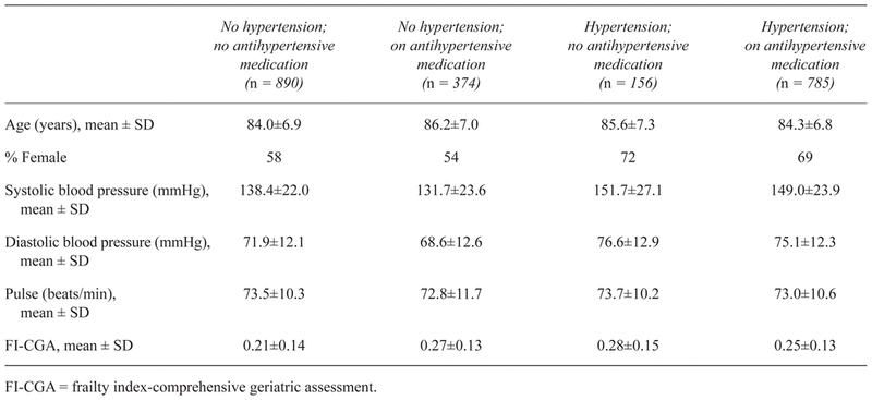 We used data from the second clinical examination of the Canadian Study of Health and Aging (CSHA-2). The CSHA was a cohort study of health problems of older adults, specifically dementia. The second clinical examination was conducted in 1996–1997.21 While the CSHA sample was population based, the clinical cohort drawn from that sample was weighted towards people with cognitive impairment. However, the CSHA-2 clinical sample was enriched to allow for cognitively intact people to be added so that frailty could be evaluated separately from cognitive impairment no dementia and dementia.22 The clinical examination included a history from participants and/or knowledgeable informants, as well as access to health records where available. Participants were classified as hypertensive based on either a history of hypertension or a measured systolic blood pressure of greater than 145 mmHg. Characteristics of the participants in this study are summarized in Table 1.