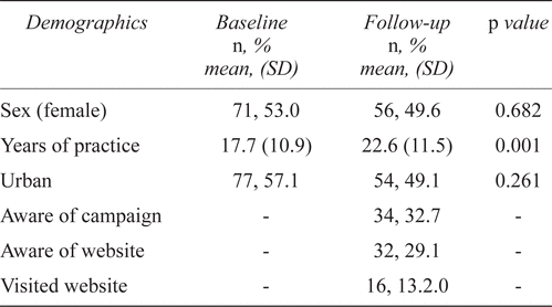 Baseline and follow-up survey results (Table 1) indicate that the demographic characteristics (gender, practice type) of respondents were consistent between baseline and follow-up surveys, except that follow-up respondents reported significantly more years of practice ( p = .01). All analyses comparing baseline and follow-up survey responses were controlled for years of practice, sex, and practice location.