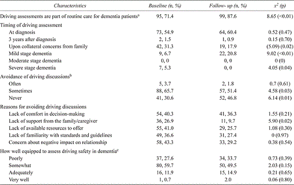 Our results should be interpreted with caution. While a paired pre- and post-survey (where each respondent was surveyed before and after the intervention) would have provided increased power with a lower sample size, the original survey was not intended as a research question, but rather to guide development of the Web-based resource. Therefore, although we cannot be sure how many respondents completed both surveys, the unpaired cross-sectional design may limit the Hawthorne effect, whereby respondents’ follow-up reports of awareness of the resource and campaign, as well as their baseline and follow-up self-reported behaviours, may be affected by the lack of anonymity. Additionally, we were unable to determine a response rate due to the fact that the surveys were distributed by the local academic institution’s continuing medical education program that did not provide numbers for its circulation. Further, it is possible that respondents may have had more of an interest in driving cessation than the non-respondents, and therefore the proportion of PCPs who routinely address issues surrounding driving as a part of routine dementia care may be high in both the baseline and follow-up data. Self-reported years of practice differed significantly between baseline and follow-up survey respondents, with the follow-up group reporting more years of practice. Although the mean for both groups is more than 15 years of practice, the difference may confound survey responses. However, driving assessment as part of routine care was not significantly associated with years of practice in the follow-up group. Finally, our results may not be applicable to other provinces that have mandatory reporting requirements for physicians.