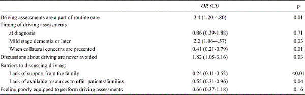 Despite a lack of confidence, Nova Scotian PCPs routinely discuss driving cessation, and perform driving assessments for individuals with dementia. The Web-based resource and awareness campaign have shown moderate effectiveness in addressing specific barriers to assessment (e.g., caregiver resistance, lack of resources). Future efforts will address additional barriers, such as lack of comfort in decision-making.