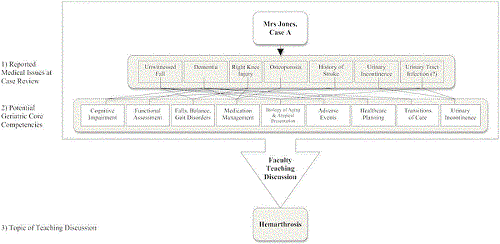 FIGURE 1 Representative patient review indicating: 1) reported medical issues at case review, 2) potential geriatric core competencies, versus 3) topic of teaching discussion