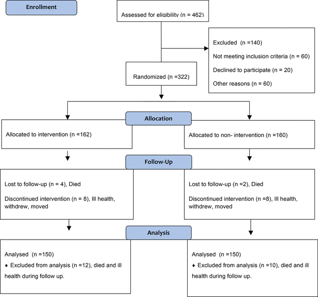 In this study seven homes for the elderly were randomly selected for the study, of which three homes were allotted as the study group and four were allotted as the control group. The study group comprised 162 elderly residents and 38 caretakers and the control group comprised 160 elderly residents and 40 caretakers.