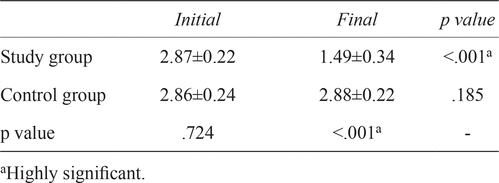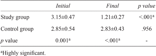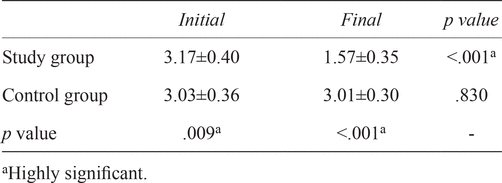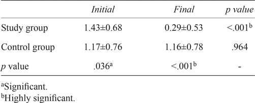 Mean score of debris in the study group decreased at the end of six months. The difference was statistically significant (p < .001).