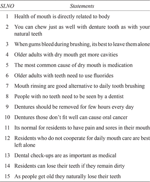 Nurses are frequently unaware of the importance of oral health care within holistic care and are unable to carry it out. Psychological barriers to working in another person’s mouth are widespread among caregivers.(2) Practical training for nurses and auxiliary care staff has frequently been recommended as a way of improving oral health care for functionally dependent elderly.(2,3,4,5) Previous studies which were done on the elderly population in Bangalore city show that the oral health status is very poor among this group, and there is a need for some oral health programs.