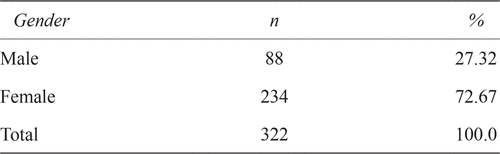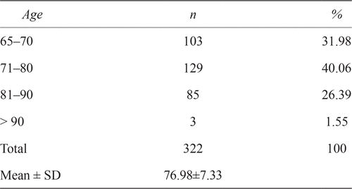 The mean age of the dependent elderly residents was 76.98 ± 7.33 (Table 1); 27.32% dependent elderly residents were males and 72.67% dependent elderly residents were females (Table 2).