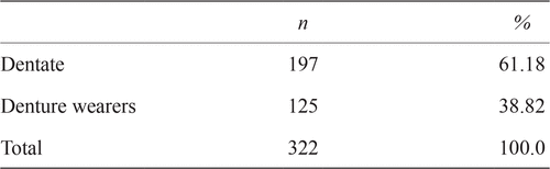 197 (61.18%) elderly residents were dentate and 125 (38.82%) elderly residents were denture wearers (Table 4).