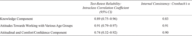 Each questionnaire component demonstrated high internal consistency (Cronbach’s α: 0.83–0.91) and test–retest reliability (intraclass correlation coefficients: 0.74–0.91). Program participants (n = 15) scored significantly higher than the comparison group (n = 12) on the knowledge component and also reported greater confidence in several areas. Qualitative data indicated that residents felt the program focused on important topic areas and appreciated the opportunity to work in an interprofessional team.