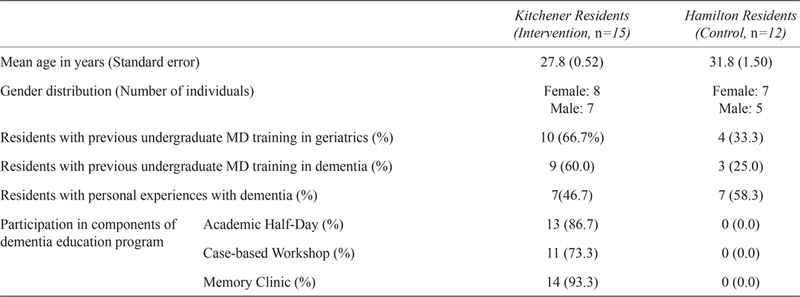 This study was approved by the University of Waterloo’s Office of Research Ethics. Descriptive statistics from the questionnaire were analyzed and reported. A pre/post-test design was originally planned; however, the limited availability of the residents to complete the data resulted in a very low yield of complete pre/post data (20%) and the planned analyses were subsequently modified. It was ascertained that the scores from FMR who participated in the test–retest of the questionnaire could serve as a comparison group, as these residents did not participate in the dementia education program or have any involvement in a memory clinic. Given that these residents completed the questionnaire twice, data from the first completion were used, as this would minimize potential testing effects. Demographic and other descriptive characteristics were compared to determine that the intervention and control groups were similar.