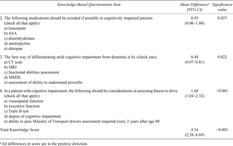 In addition to total knowledge score, which demonstrated a large and significant difference between groups, scores on three knowledge-based items were also significantly higher in the Kitchener site group. One of these items was related to driving, while another to medications. Interestingly, participants in the feedback interviews specifically mentioned driving-related issues and pharmacotherapy as two key areas where they felt their knowledge had improved. Related to the comfort and confidence component of the questionnaire, participants demonstrated statistically significant improvements in their reported confidence managing dementia and prescribing appropriate pharmacotherapy. These findings are once again consistent with what was expressed by participants in the feedback interviews. Moreover, pharmacotherapy has been identified in the literature as a particularly challenging area for practicing family physicians.(8,13)