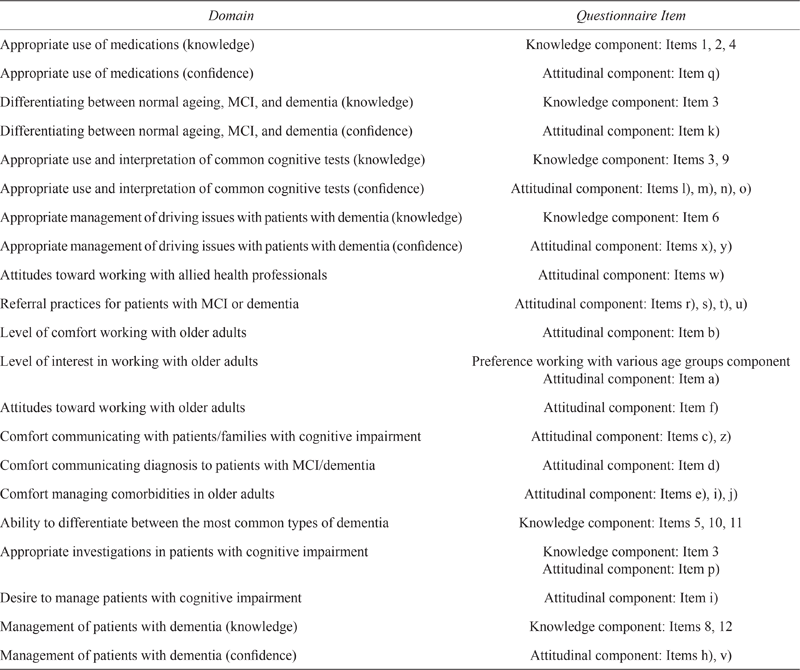 The evaluation questionnaire was developed in collaboration with the physician investigator (LL). The questionnaire consisted of a 12-item multiple choice knowledge component, an 8-item component assessing attitudes toward working with various age groups, and a 26-item component assessing attitudes and confidence toward the diagnosis and management of dementia. To develop the knowledge component, topic areas related to dementia that were deemed essential knowledge for graduating FMRs were identified from the McMaster University Department of Family Medicine Postgraduate Residency Care of the Elderly Objectives.(11) In order to develop the attitudinal, comfort, and confidence components, current literature was examined.(5,7,12) The majority of existing questionnaires, surveys, and scales identified were largely geared toward family physicians. Pertinent questions were identified by one author (JCP) and modified to ensure they were applicable to FMR. Additionally, LL provided input regarding modifications and the suitability of questions, and developed additional questions relevant to the specific content of the education program. The attitudinal, comfort, and confidence items were structured as statements to which residents were asked to provide their levels of agreement on seven-point Likert scales.