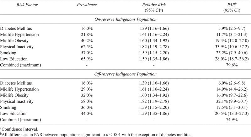 When examining the on-reserve and off-reserve Indigenous populations (Table 2), the highest PAR for both groups was again for physical inactivity. Most PARs were higher among on-reserve Indigenous peoples in Canada than among off-reserve Indigenous peoples, with the exceptions being diabetes mellitus (same in the two groups) and midlife hypertension (higher in the off-reserve group). The greatest differences in PARs were in those associated with smoking (7.7%) and low education (7.5%) (p < .001). The estimated combined PAR for all six risk factors neared 80% for on-reserve Indigenous peoples in Canada and was approximately 5% lower among off-reserve Indigenous peoples. For additional detail regarding the prevalence, relative risks, and PAR associated with each risk factor in the on- and off-reserve Indigenous peoples in Canada, refer to Table 2.