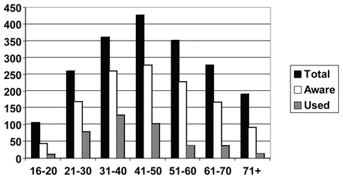 NHS Direct awareness and use varied with patient age (Table 1, Figure 1). In the over-70-years age group ( n = 191), proportional awareness of NHS Direct (47.6%) was next to lowest, the exception being the 16–20 age group. NHS Direct use by the over-70-years age group, both as a proportion of total number (6.8%) and of those aware (14.3%), was the lowest recorded.