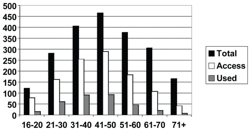Internet access and use varied with patient age (Table 2, Figure 2). In the over-70-years age group ( n =213), proportional access to the Internet (19.7%) was the lowest recorded. Internet use by the over-70-years age group as a proportion of the total number (3.8%) was also the lowest recorded, with no over-80-years age group using the Internet to search for medical information, and as a proportion of those with Internet access (19.0%) was second lowest, next to the 61–70 age group.