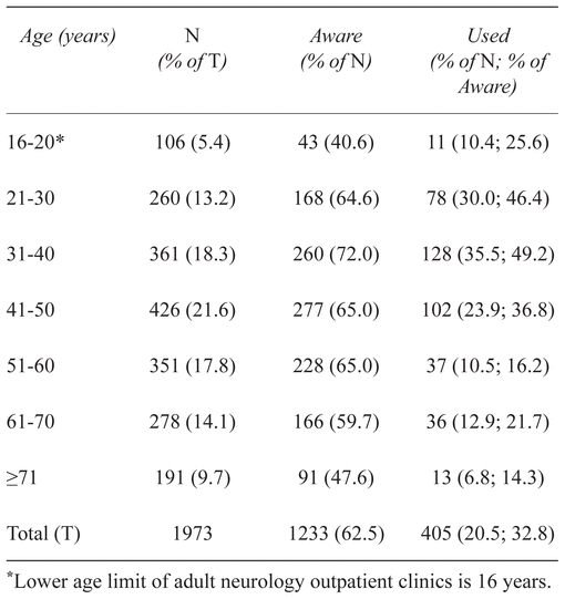Awareness and use of NHS Direct by patient age, general neurology outpatient clinics, 2002–2010
