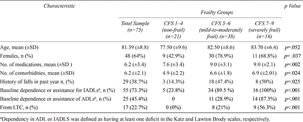 Those in higher CFS strata had more co-morbidities and medications at baseline. They were also more likely to be female, require assistance or be dependent with IADLs and ADLs, and to come from a long-term care facility (LTC). Patients in higher frailty strata also tended to be older, but the difference was not statistically significant (Table 1).