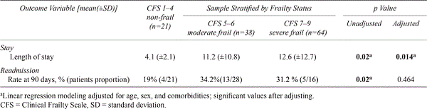 Severe frailty was associated with longer lengths of stay (Mean = 12.6 ± 12.7 days) compared to mild-to-moderate frailty (mean = 11.2 ± 10.8 days), and non-frailty (mean = 4.1 ± 2.1 days, p = .014). This finding was significant after adjusting for age, sex, and number of medications. Participants with higher frailty scores showed higher readmission rates when compared with those with no frailty (31.2% for severely frail, vs. 34.2% for mild-to-moderately frail vs. 19% for non-frail) although there was no significant difference in the adjusted analysis.