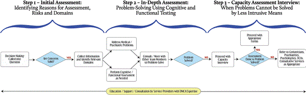 The DMC best-practice assessment process begins with identification and validation of reasons for the DMCA of a client in a specific domain(s). Relevant information is then collected, reversible medical conditions addressed, and social, cognitive, functional and/or psychological assessments are conducted. If the client is medically stable, least intrusive/restrictive options are sought. When less intrusive means cannot be found through problem-solving and a declaration of incapacity is thought to be required, a Capacity Assessment Interview is undertaken. Experts (physicians, geriatricians, psychologists, psychiatrists, designated capacity assessors (DCAs: court-appointed assessors with social work, nursing or occupational therapy backgrounds)) and specialty services are consulted for more complex cases.