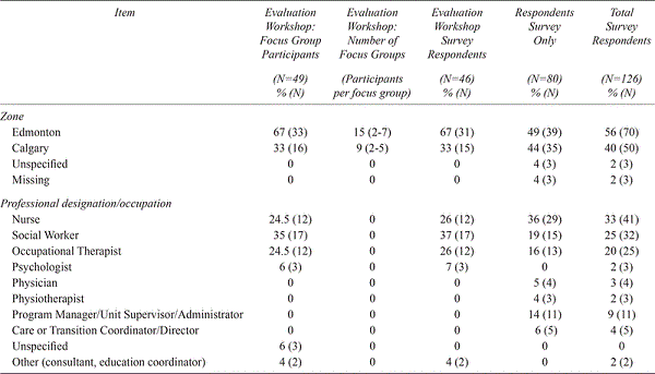 This evaluation applied a mixed methods approach;(32) focused ethnography(33,34) guided data collection and analysis. HCPs and key stakeholders familiar with the Model were invited to either participate in one of two day-long evaluation workshops held in Edmonton and Calgary that included focus groups (FGs) and a survey, or to complete only the survey. Workshop participants were recruited through invitations distributed by members of advisory and steering committees; surveys were likewise distributed via e-mail and paper copy to HCPs and key stakeholders who were unable to attend the workshops.