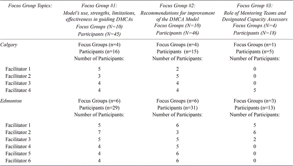 Development of the DMCA Model (described in Parmar et al.(26,27)) by an acute care IP team began in 2006. Aiming to improve the quality of DMCAs and reduce unnecessary declarations of incapacity, a well-defined, standardized process and supporting tools were developed and trialed. As development of the Model and the province’s Adult Guardian and Trusteeship Act (AGTA)(25) governing DMCAs coincided, the two are closely aligned, with the Model supporting operationalization of the capacity assessment process in the AGTA. It has since been utilized by independent practitioners, and IP teams in Calgary and Edmonton (serving 65% of Albertans),(28) and continues to be developed and adapted for use across the continuum of care and service sectors.