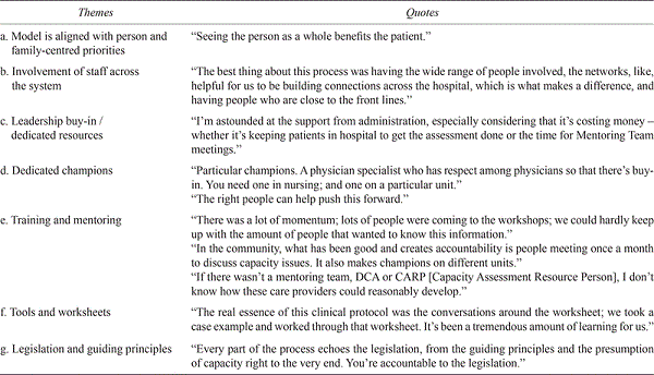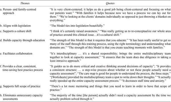 Several benefits were identified with use of the Model. Most significantly, it is person-centred, aims to determine least restrictive/intrusive outcomes, and reduces the likelihood of unnecessary declarations of incapacity. The Model supports patients and families; builds capacity among HCPs and senior leaders through education/mentoring; provides a standardized best-practice process; cultivates a problem-solving approach; facilitates IP collaboration; and encourages HCPs to work to full scope of practice. It also facilitates culture change (see Table 4).