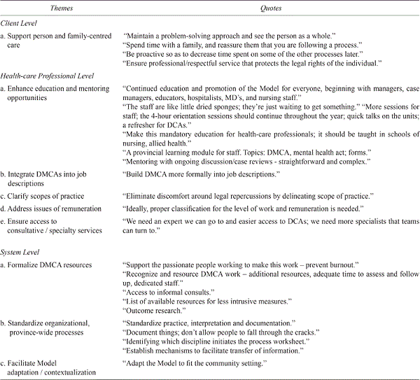 While participants valued the Model, they also recommended improvements at the client, HCP, and system levels. An increased focus on person-centred care and family inclusion, greater communication across and between organizations, and minimization of duplicated assessments was encouraged. HCP-level recommendations revolved around enhanced and sustained access to education/mentoring, integration of DMCAs into job descriptions, appropriate remuneration, and timely access to consultative/specialty services. Allocation of dedicated DMCA resources, clearer organizational/system processes, a province-wide information and workload measurement system, and better collaboration across systems and organizations were identified at the system level (see Table 7).