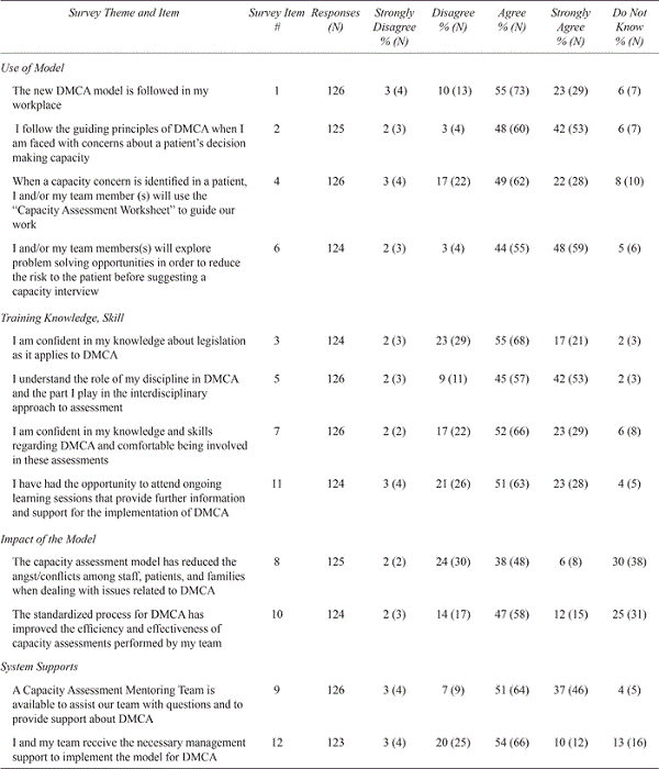 The Decision-Making Capacity Assessment (DMCA) Model includes a best-practice process and tools to assess DMCA, and implementation strategies at the organizational and assessor levels to support provision of DMCAs across the care continuum. A Developmental Evaluation of the DMCA Model was conducted.