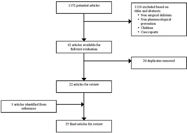 A literature review was conducted using the databases PubMed, and Embase. The literature published from January 1, 1999 to December 31, 2014 was searched using the following terms: delirium, post-operative delirium, post-operative cognitive dysfunction, surgical procedures, post-operative period, post-operative complications, antipsychotics, haloperidol, quetiapine, risperidone, olanzapine, cholinesterase inhibitors, donepezil, galantamine, rivastigmine, memantine, statins, hydroxymethylglutaryl coenzyme A reductase inhibitor, and melatonin. This time period was determined because the first relevant article was published in 1999.(7) A total of 1152 potentially relevant articles were identified. After an evaluation based on the titles and the abstracts, 1110 articles were excluded if the delirium was not in a post-operative period, if the preventative measures were solely non-pharmacological, if the pharmacological agent was used only to treat delirium and not to prevent it, and if the patients enrolled were children. Case reports were also excluded. Forty-two articles remained available for a full-text evaluation. Twenty articles were duplicates and were therefore removed from the primary studies. Finally, three articles were identified from the references of the other studies selected. The final number of articles reviewed in this study was 25, as demonstrated in Figure 1.