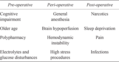 Delirium is a neuropsychiatric disorder characterized by a sudden onset of altered and fluctuating level of consciousness, inattention, and disorganized thinking.(1) The etiology is organic and sometimes modifiable. Surgery, especially high operative stress procedures such as major joint replacements or cardiovascular surgery, is a strong risk factor. The incidence of post-operative delirium (POD) is extremely variable; a review of 80 primary studies showed a range from 0% to 73.5% (average 36.8%).(2) The factors associated with POD may be divided into pre-operative, perioperative, and post-operative as demonstrated in Table 1.(3)