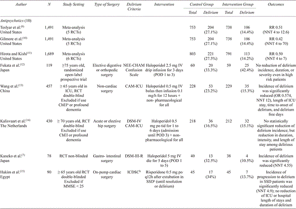 13. Wang W, Li HL, Wang DX, et al. Haloperidol prophylaxis decreases delirium incidence in elderly patients after noncardiac surgery: a randomized controlled trial. Crit Care Med. 2012;40(3):731–39.