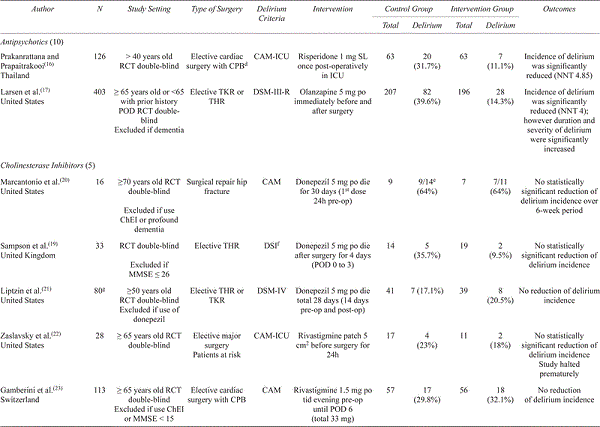 Larsen et al.(17) published the only study with olanzapine, which was a double-blind randomized controlled trial with patients undergoing elective hip or knee replacements at the England Baptist Hospital in Boston, MA, from 2005 to 2007. The patients screened for the trial included all patients age 65 years or older and those less than 65 years old with a history of post-operative delirium who were scheduled for elective total knee- or total hip-replacement surgery. Patients with dementia were excluded. Four hundred and ninety-five patients were stratified and 95 patients dropped out before receiving the study drug. Therefore, 400 patients completed the study (intervention group n = 196, placebo group n = 204). The mean age was similar in both groups (73.4 years in olanzapine group and 74.0 in placebo group). The intervention group was given a total 10 mg of olanzapine by mouth in two divided doses: 5 mg immediately before the surgery and 5 mg immediately after the surgery. Delirium was diagnosed using the DSM-III-R criteria. There was a reduced incidence of post-operative delirium in the olanzapine group compared to placebo (14.3% versus 39.6%, p < .0001). However, the patients receiving olanzapine who developed delirium had a more severe and prolonged delirium that was attributed to the greater anticholinergic property of this antipsychotic (2.2 days versus 1.6 days, p = .02).
