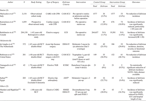 Yamaguchi et al.(43) completed a double-blinded randomized controlled trial using ramelteon. It is a sleep agent that binds specifically to MT1 and MT2 receptors in the hypothalamus. They enrolled 42 patients who were 70 years old or older who underwent elective total knee replacement. The intervention group was given ramelteon 8 mg orally every night for four days. There was no statistically significant difference of POD between the two groups (0% in ramelteon group versus 9.2% in placebo, p = 0.48) or subsyndromal delirium. Only the abstract was available at the time of this review.