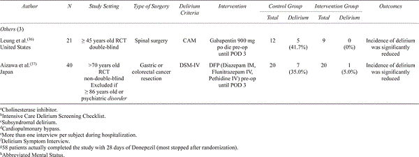 Since sleep disturbance is a core feature in delirium, Aizawa et al.(37) published a non-double blinded controlled clinical trial using different sedative agents to improve sleep after surgery and thus prevent POD. A total of 42 consecutive patients aged over 70 years old, but less than 86 years old, who underwent gastric or colorectal cancer resections under general anesthesia were enrolled in Hiratsuka City Hospital, Japan. Patients with “mental disorders” were excluded. Delirium was diagnosed using the DSM-IV criteria. Two patients dropped out due to incomplete administration of the agents. Forty completed the study (intervention group n = 40, placebo group n = 40) with a mean age of 76 years old in both intervention and non-intervention groups. The intervention group received the “delirium-free protocol” (DFP), which is intramuscular diazepam, intravenous flunitrazepam infusion, and intravenous pethidine infusion for the first three post-operative nights, from 8:00 pm until 4:00 am. The non-DFP group did not receive a placebo. There was a significant reduction of post-operative delirium in the intervention group (35% versus 5%, p = .023). However, eight patients in the DFP group (40%) developed “morning lethargy”.