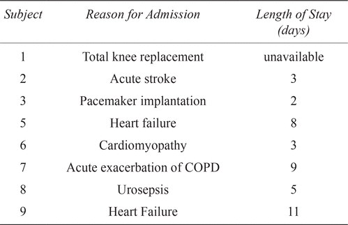 Subjects ranged in age from 76 to 94 years of age. There were six women and three men. Reasons for admission and length of stay varied (summarized in Table 1). One narrative was discarded as it became apparent during the interview that the subject was unable to recall and/or relate their experience without significant spousal assistance. The remaining eight interviews were transcribed for analysis. Spontaneous narratives lasted between 1:19 and 10:28 minutes. The complete interview durations ranged from 7:29 to 14:52 minutes. The spouses of subjects were present for two of the interviews, but their comments were eliminated from the final transcribed narratives.