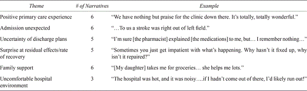 Following analysis by CW and DH, six themes were identified in three or more of the narratives. These included an overall positive experience with their primary care provider, the unexpected nature of their hospitalization, uncertainty regarding discharge plans, feelings of shock or surprise with the residual effects of their illness and the slowness of their recovery, the necessary support of family members during these transitions, and displeasure with the hospital environment itself (Table 2).