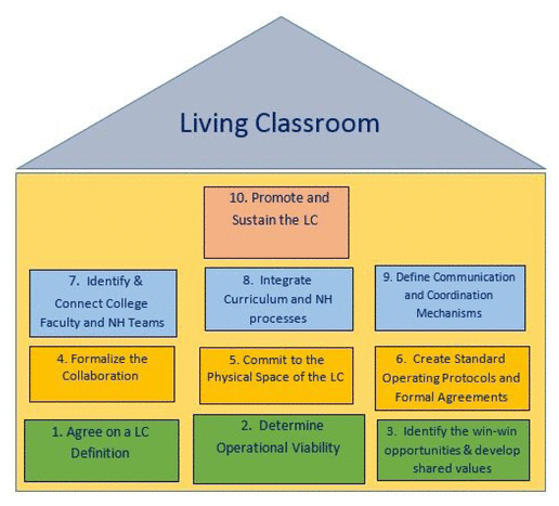 This framework described the four layers of exploring the potential for the LC, developing the foundations for the LC, implementing a LC, and promoting and sustaining the LC, represented by 10 building blocks. The partners’ context, students, college faculty, NH teams, residents, and families all play vital roles in making the LC a success. Many teachable moments are created beyond knowledge and skill acquisition, including interpersonal communication and relationship building, team culture, workload management, IP relations and more.