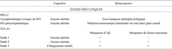 De manière à diagnostiquer la MA chez les sujets asymptomatiques, le NIA-AA compte aussi sur l’utilisation de biomarqueurs. Les marqueurs reflétant l’accumulation d’Aβ cérébrale et ceux indiquant une lésion neuronale sont utilisés pour diviser l’Alzheimer préclinique en trois phases (tableau 1). Les patients avec déclin cognitif subtil ne remplissant pas encore les critères standardisés du TCL sont aussi inclus dans la rubrique « MA préclinique » lorsque les biomarqueurs sont positifs (tableau 2). Ces recommandations, destinées initialement à des fins de recherche, ouvrent donc la porte au diagnostic de la MA avant l’apparition de symptômes.