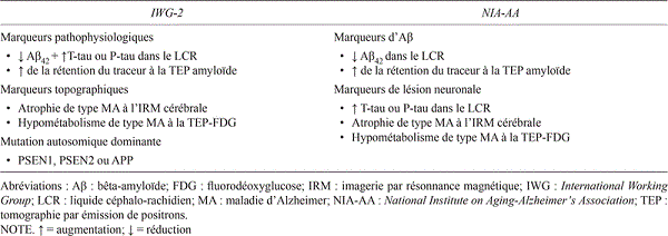 En 2007, l’International Working Group (IWG) for New Research Criteria for the Diagnosis of Alzheimer’s Disease a proposé des critères destinés à des fins de recherche communément appelés les « critères de Dubois », permettant de diagnostiquer la MA dans sa phase prodromale, avant qu’elle n’interfère avec le fonctionnement quotidien(9). Pour ce faire, les critères cliniques, incluant une atteinte de la mémoire épisodique, devaient s’accompagner d’au moins une « empreinte » biologique de la maladie (biomarqueur).