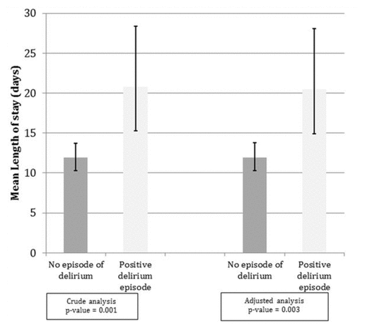 The secondary outcome of hospital LOS could have suffered from lack of adjustment. We adjusted for non-modifiable risk factors of delirium, such as age and comorbidities. However, our sample prevents us from adjusting for final diagnosis. This could have overestimated the LOS impact, although our results are similar to previous in-patient studies.(15)