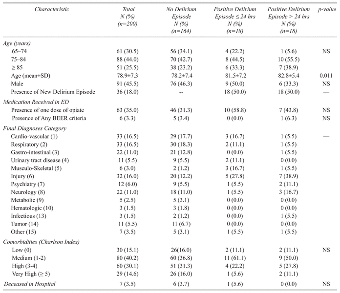 The presence of delirium was assessed using a chart-based CAM:(12) orientation, hallucinations, agitation, confusion, fluctuation, state of consciousness scale. Positive delirium episode were categorized as early onset (within 24 hrs after the required 12-hr ED exposition) or late onset (after 24 hrs of the 12-hr ED exposition).