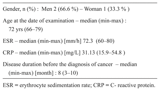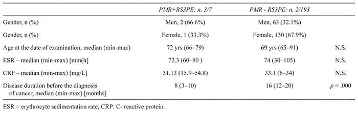 The presence of RS3PE was observed in only seven patients with PMR (3.5%). In three of the seven patients with RS3PE associated with PMR (5 M, 2 F) it was possible to recognize a tumor: prostatic cancer, vescical cancer, multiple myeloma (Table 1). In all these patients, RS3PE presented before the discovery of the malignancies. Its reappearance after a short while represented in all three cases an element of strong suspicion. Subsequent diagnostic decisions were indicated by specific signs: significant rise of prostate specific antigen or appearance of hematuria or a monoclonal peak at protein electrophoresis. In all these patients, the treatment of neoplasias caused the total and permanent disappearance of RS3PE syndrome. No recurrence was observed during follow-up. In 193 PMR without RS3PE patients, only in two cases did PMR have a paraneoplastic manifestation: in the first case of a neuroendocrine tumor gastric gastrin-secreting; in the second case of a non-Hodgkin lymphoma. In the first case (man 67 years old), a concomitant macrocytic anemia was the key to reaching this final diagnosis.(17) When the two groups (PMR without RS3PE vs. PMR + RS3PE) were compared (Table 2), the disease duration of PMR before the diagnosis of cancer was, in the first group, double that in the second group. There is no significant difference with respect to age of onset, ESR, and CRP. Females are much more represented in the second group than the first, confirming the fact that RS3PE syndrome is much more common in males, while the PMR alone is more frequent in females.