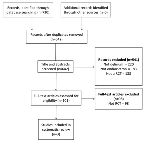 Serotonin has been postulated to play in role in delirium, and observational studies have shown higher levels in delirious patients.(7) This is further supported by the fact that delirium is a major manifestation of serotonin syndrome. Ondansetron is a serotonin antagonist specific for the 5-HT3 receptor which is routinely used post-operatively for nausea and vomiting. It has a better safety profile than haloperidol, which is the most commonly used agent for treating and preventing POD.(8) There has been interest in the literature about the role of ondansetron in the prevention and treatment of POD. Earlier observational studies found a positive role for ondansetron in the treatment of POD after cardiac surgery.(9) We performed a systematic review of the literature in order to summarize randomized controlled trials (RCTs) examining the role of ondansetron in the prevention and treatment of POD.