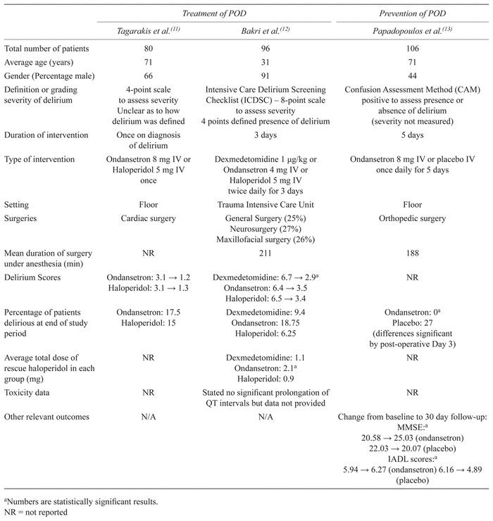 Tagarakis et al.(11) examined 80 delirious patients with a mean age of 71 years post-cardiac surgery. Patients with a history of psychiatric disease were excluded. Patients were diagnosed with delirium based on a 4-point scale: 0 = normal, 1 = restless and mild confusion, 2 = disoriented but cooperative, 3 = disoriented and uncooperative, 4 = violent and aggressive with hallucinations. The patient’s delirium scores were measured before and 10 minutes after the administration of the drug. Patients received either ondansetron 8 mg or haloperidol 5 mg intravenously (IV) as a single dose on diagnosis of delirium. It was unclear how the diagnosis of delirium was actually made. There were no significant differences between the groups in terms of important variables such as type of cardiac surgery performed.