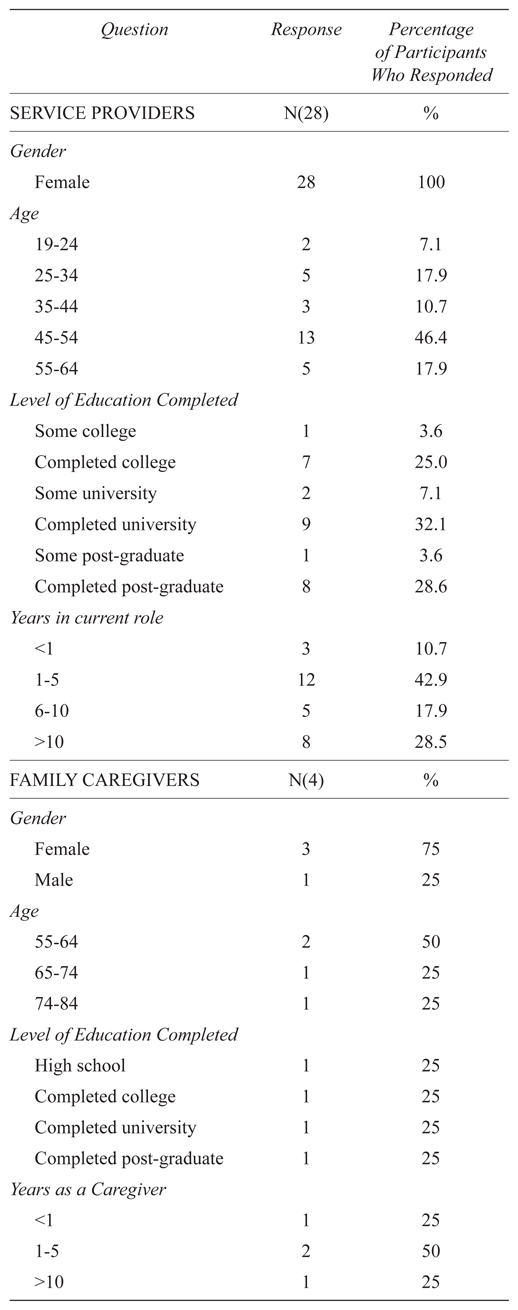 This qualitative study was guided by Rogers’ Theory of Diffusion of Innovations [NY: Free Press; 1995], and involved focus group and individual interviews of service providers (n = 31) and family caregivers (n = 4). Interview transcriptions were analyzed using descriptive, topic, and analytic coding, followed by thematic analysis.