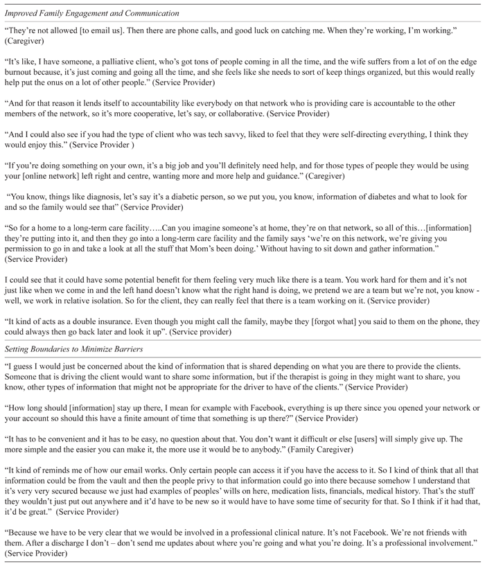 The topics that emerged from the initial data analysis were privacy concerns, existing communication challenges, and opportunities for teamwork. These were further refined using analytic coding and theming. As a result, two major themes were identified as critical to understanding the potential for the use of networks in a home-care setting: 1) improved family engagement and communication, and 2) setting boundaries to minimize barriers.