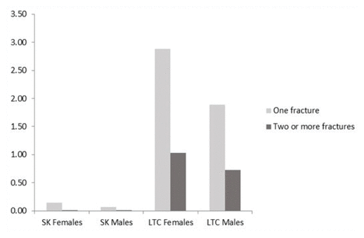 Individuals in Saskatchewan (including those in LTC) had from none to four separate HFs recorded during the five-year study period. Repeated fractures recorded for the same hip could have included completely unrelated fractures of the same hip, but also fractures around the stem of a previous replacement occurring after 28 days. The percentage of people suffering one or two and more hip fractures, with duplicate entries removed as described in the Methods section, are presented in Figure 1 for the province and for the LTC cohort, stratifying by sex. A greater percentage of residents in the LTC cohort had repeated fractures during the study period, and three or more HFs in the same individual were only reported in the LTC cohort.