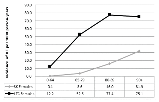 FIGURE 2 Hip fracture (HF) incidence in females in the province of Saskatchewan (SK), and in long-term care (LTC) residents, 2008–2012 |