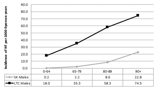 FIGURE 3 Hip fracture (HF) incidence in males in the province of Saskatchewan (SK) and in long-term care (LTC) residents, 2008–2012 |