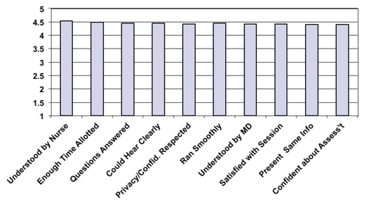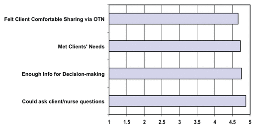 Clients felt they were understood by the on-site nurse (96%) and the physician who was being teleconferenced (94%). Almost all patients agreed that their privacy and confidentiality were respected (98%), although a small number stated they would have preferred to see their doctor alone (16%). In terms of their sense of involvement in their care, most patients felt that their questions were answered by the doctor (98%), that the video conference session ran smoothly (98%), and that the appointment provided enough time to deal with everything that needed to be covered (92%).